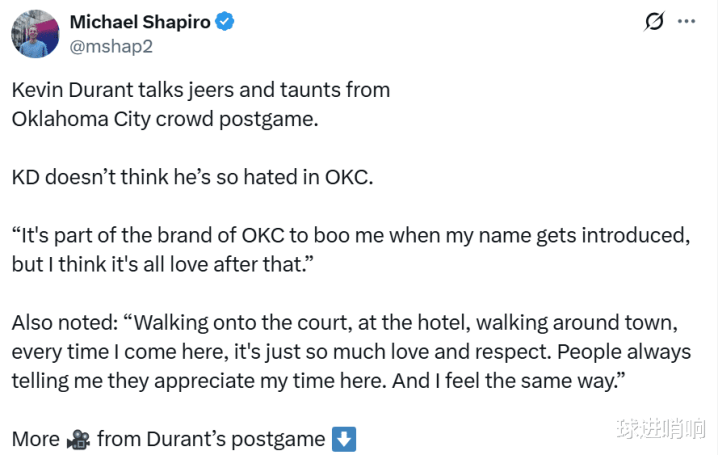 赛后杜兰特表示嘘声是雷霆球迷的标志之一,我认为这是他们爱我的表现,每次来到这里,都会感受到无尽的爱与尊重,他们很珍惜我在这里度过的时光,我也这样。