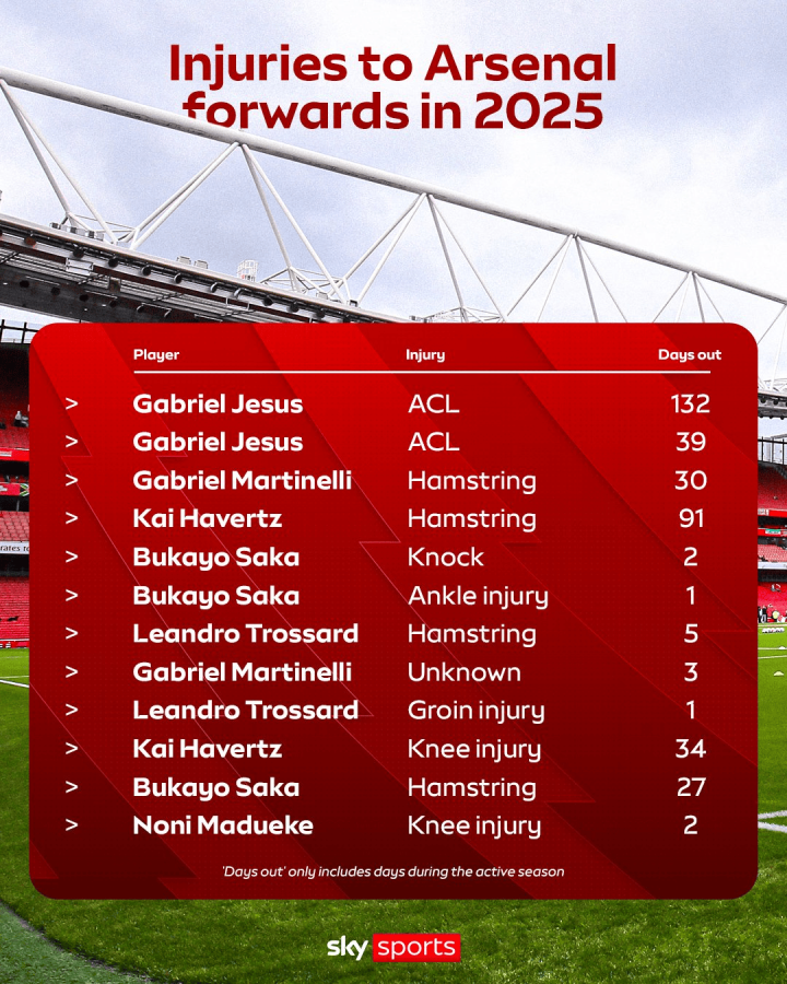 阿森纳前锋2025共遭遇12次伤病, 其中热苏斯伤停近半年