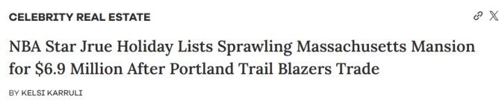 北京时间10月22日,据《纽约邮报》报道,朱-霍勒迪与凯尔特人队“解绑”毫不拖泥带水。在被交易至开拓者队仅数月后,他便以690万美元的价格挂牌出售位于马萨诸塞州的豪宅。