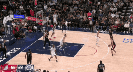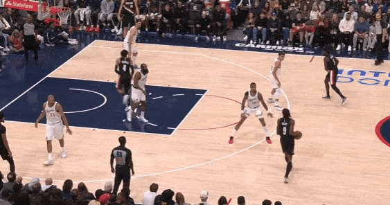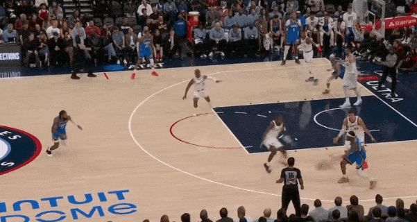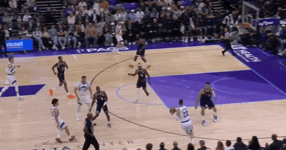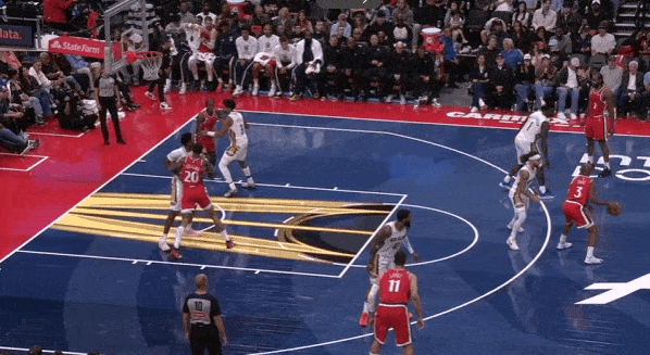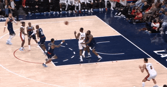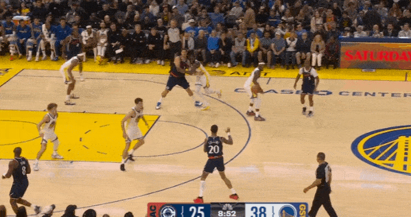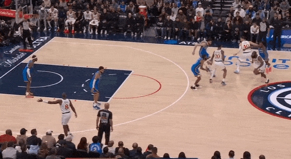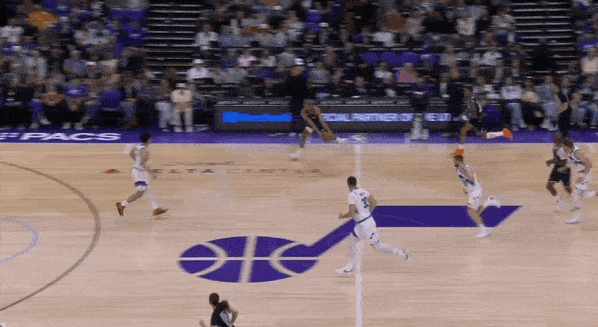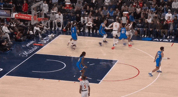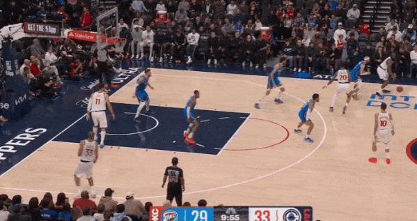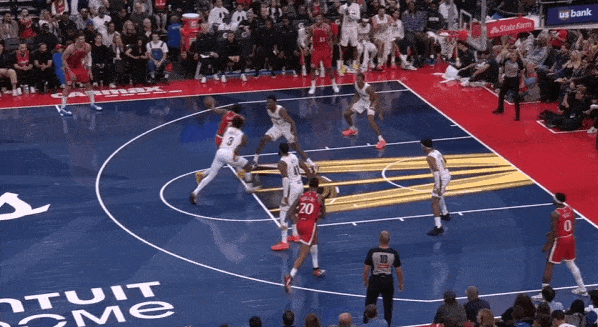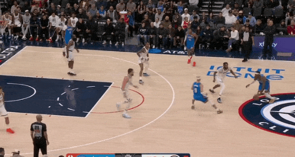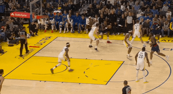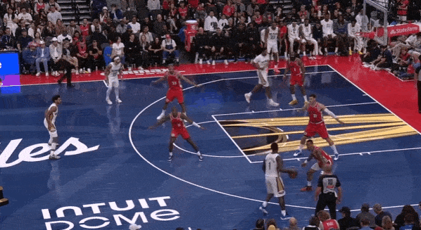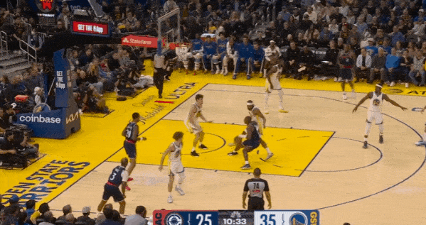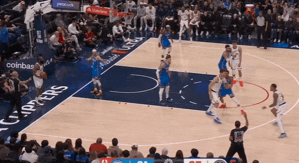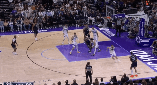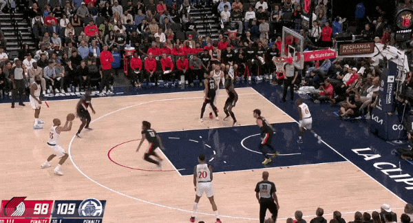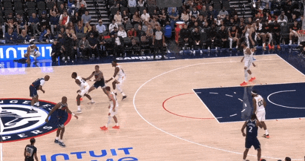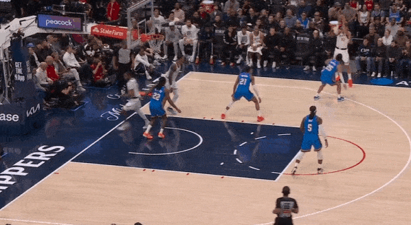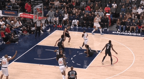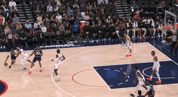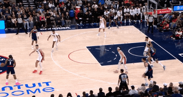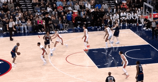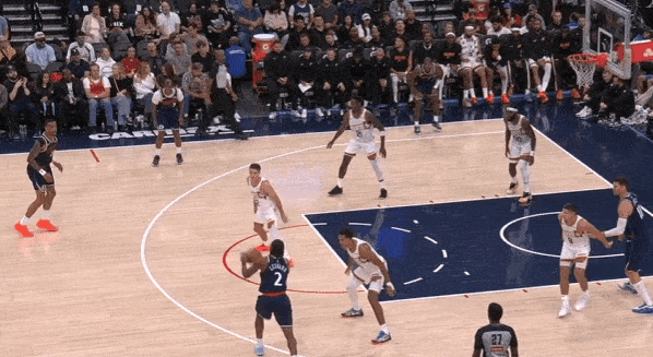 当然,这里面有对方中锋有时在对位大洛,让大洛做掩护更能调度对方护框手的因素。但首先,是不是可以增加一些双掩护战术的频率?既能起到调度护框手的效果,也能让科林斯补足大洛不具备的顺下爆发力,并且二人可以灵活选择顺下、外拆,并不会有互斥的情况。
