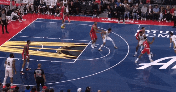 比如这两个防守锡安的回合,首先防守站位就很奇怪,一般来说球员边线拿球采取针对性防守站位都是“将球员往边线驱赶”和“逼迫球员走非惯用手侧”,而科林斯的防守站位更像是“诱导锡安使用惯用手走中路”、“把锡安放进去直面护框手”。