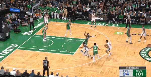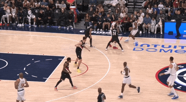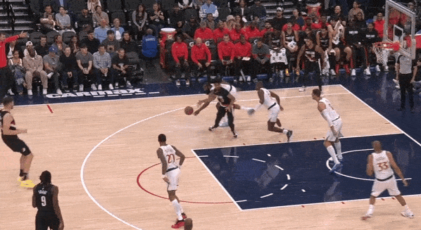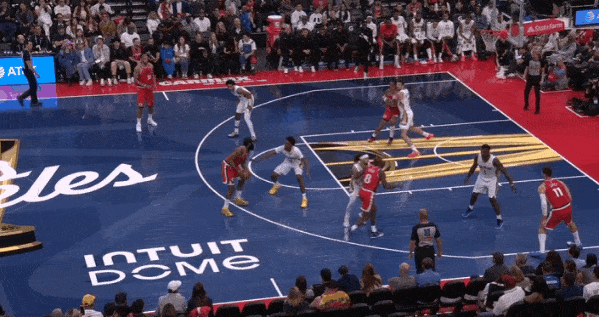 转换进攻要到夏普错位,回球给哈登后顺势掩护然后立马'Slip“下顺,和哈登强侧配合惩罚错位。