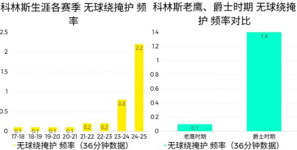 可以看到,老鹰时期的科林斯,几乎没有无球借掩护的战术戏份。而在24季哈迪已经开始让科林斯少量尝试,25季进一步把频率增加到了2.2次。综合产效,仅就上赛季表现而言,可以说现如今的科林斯已经开发出了这项技能。”