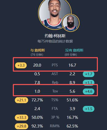 当科林斯与哈登同场时,得分会明显提高(虽然有三分更准因素)、篮下效率暴涨、失误率暴跌。