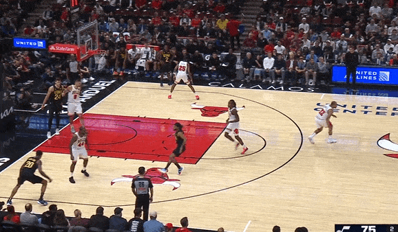 格兰特佯装借助霍勒迪掩护,科林斯被误导后将左脚向后挪了一小步,格兰特直接“拒绝掩护”变向左路突破攻击前脚,科林斯在先手就吃了亏,一开始还能凭借着留出的一小段“缓冲空间”勉强跟住,但在后续的跟防、连续横移滑步过程中被摆脱。